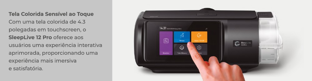 Com uma combinacao de recursos nunca antes vista em um CPAP Gaslive, o SleepLive 12 Pro se destaca como um dos equipamentos mais completos do mercado. Inclui relatório com Curva de Fluxo e Assistente de Terapia, que auxiliam tanto os usuários quanto os profissionais da saude em tratamentos mais eficazes, além de oferecer recursos que aprimoram a experiência do usuário, como conectividade 4G e uma tela colorida touchscreen de 4.3 polegadas.